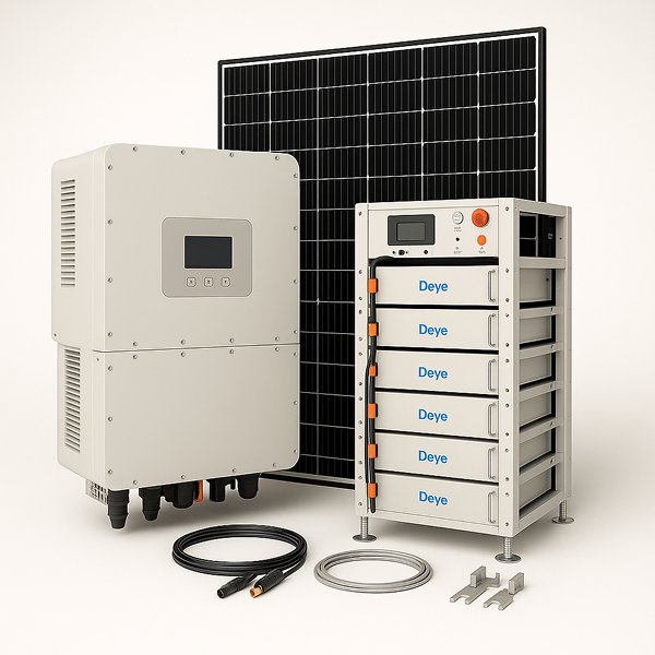 Домашня сонячна станція 20 кВт 3-фазна Deye під ключ — потужна система для приватних будинків або підприємств, що потребують високої генерації та повної автономії. Оснащена інвертором Deye SUN-20K-SG01HP3-EU-AM2, чотирма акумуляторами BOS-GM5.1 (5 кВт·год LiFePO₄) та BMS-блоком HVB750V/100A-EU зі стійкою 3U-HRack-2G.